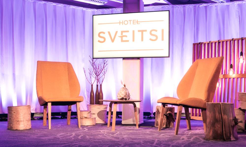 Teimme Hotelli Sveitsiin virtuaalistudion hotellin kokousvieraiden käyttöön, josta voi lähettää livestreamia verkkoon ja katsoa myös suorana hotellihuoneesta, kuin myös jättää esitykset esimerkiksi yrityksen netsivustolle myöhemmin katsottavaksi.